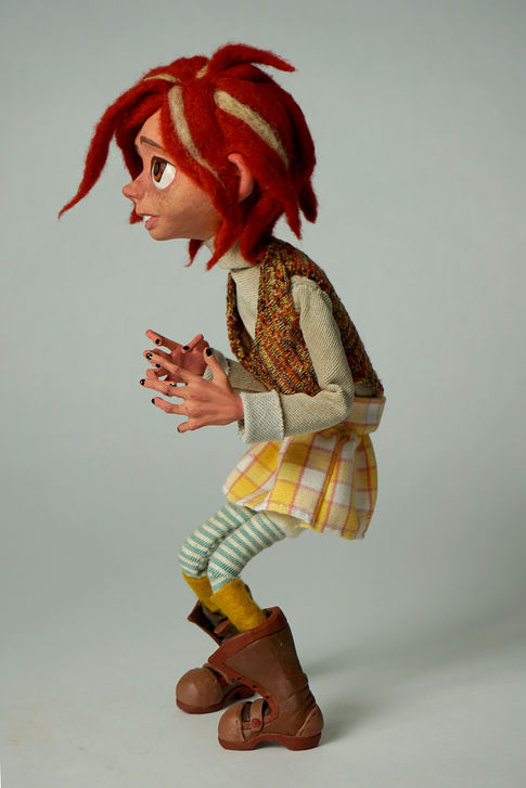 The puppet is made with sculpey clay, fabric, wool, and wire.